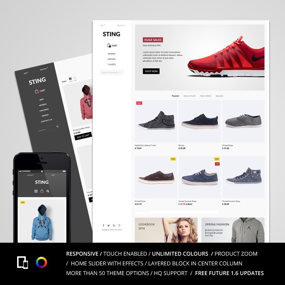 Sting Template for Prestashop - Sting, nötr tasarıma ve gelişmiş stil değiştirme modülüne sahip bir temadır; böylece farklı yazı tip